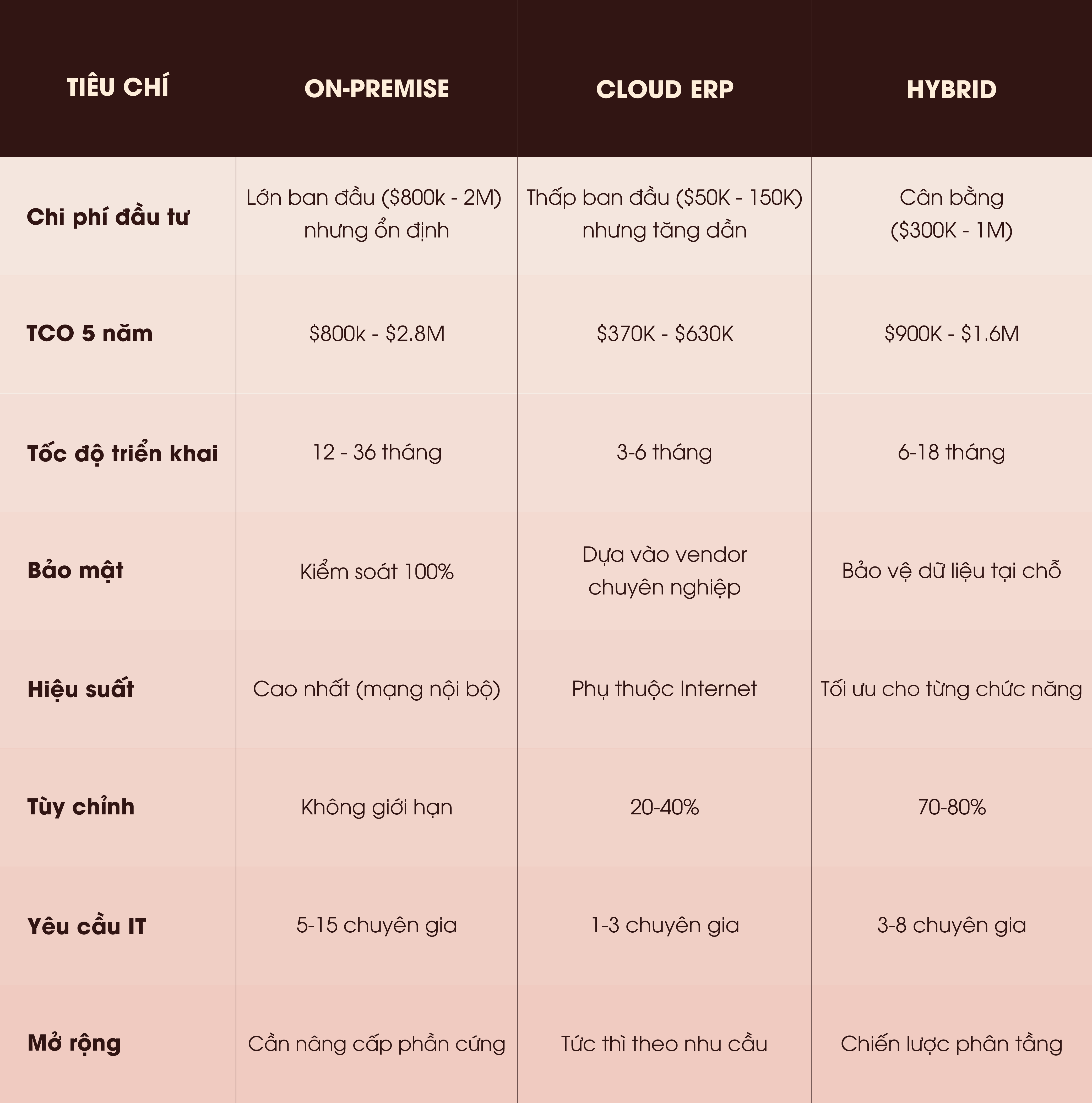 Doanh nghiệp hiện nay có ba lựa chọn chính khi triển khai ERP: Tại chỗ (On-premise), Đám mây (Cloud) và Kết hợp (Hybrid). Mỗi mô hình ERP có ưu nhược điểm riêng và phù hợp với các nhu cầu kinh doanh khác nhau: